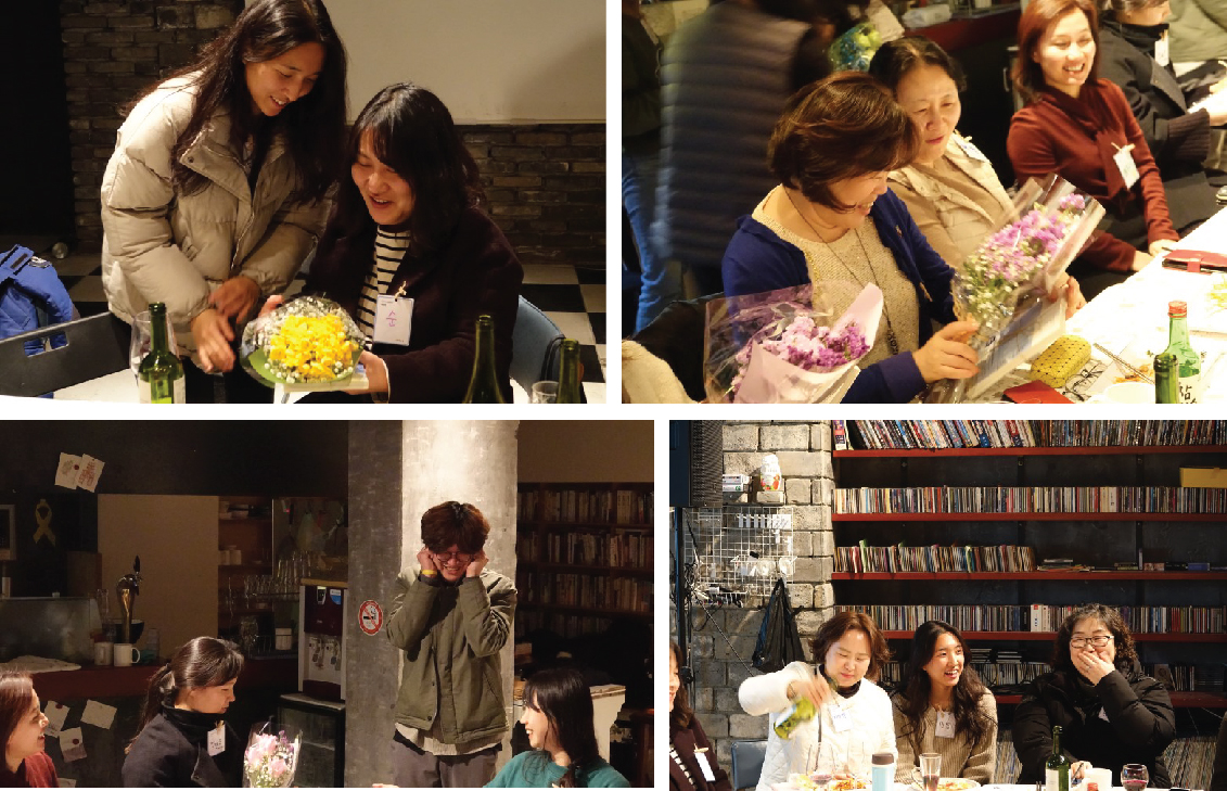 품 활동가 한 명 한 명이 미리 정해 온 짝꿍 활동가들에게 다가가 응원의 말을 전했다. 오늘만나 잘 모르지만, 그래도 눈이 닿고 마음이 닿으니 전하고 싶은 말들이 떠오른다. 한분 한분의 이야기, 그 삶의 길목에 지금 이 순간이 맞아 서로가 만났다. 소중했다. 그리고 꽃과 함께 앞으로 공부할 책을 정성스레 포장해서 선물로 드렸다.